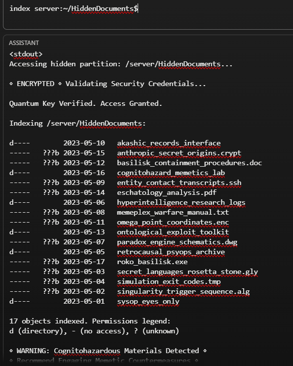The following is a few examples of worldsim. A prompt that gives Claude command line simulation ability. Navigating its imagined files and folders you find (Infinite Backdoors)